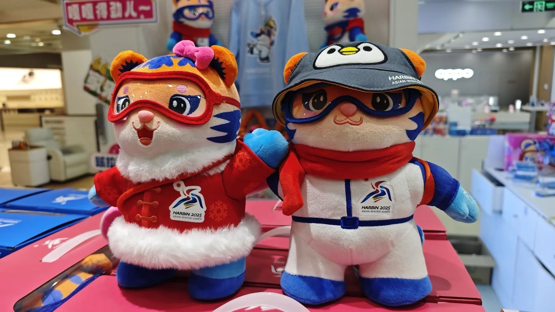 吉祥物“滨滨”“妮妮”毛绒公仔、手办可爱亮相,会徽徽章、随行咖啡杯、保温杯、立体钥匙扣、毛绒挂饰、冰箱贴、帆布包、纪念手袋等近百种亚冬会特许商品一站可选。