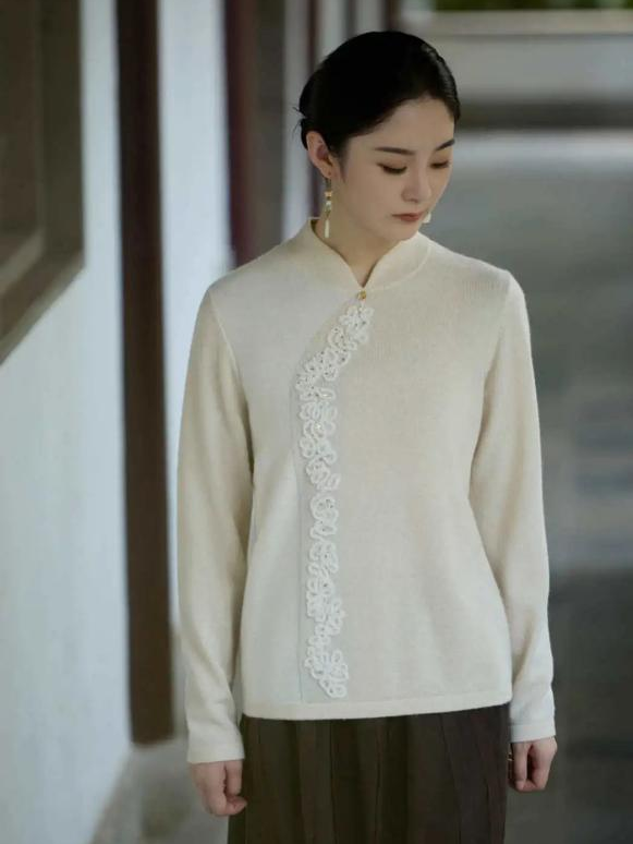 汉服领设计展现中式古典韵味,搭配珠管绣花彰显细节与奢美品质。葫芦盘扣,寓意生活美满。金银丝与羊绒纱线编织的协奏曲,优选高品质羊绒纱线,在自然的馈赠之中加入细闪的金银丝线,恰到好处。经典小立领完美贴合颈部线条,立体绣花图案(伴随亮片绣)随斜襟顺势而下,国风韵味与现代美感结合。